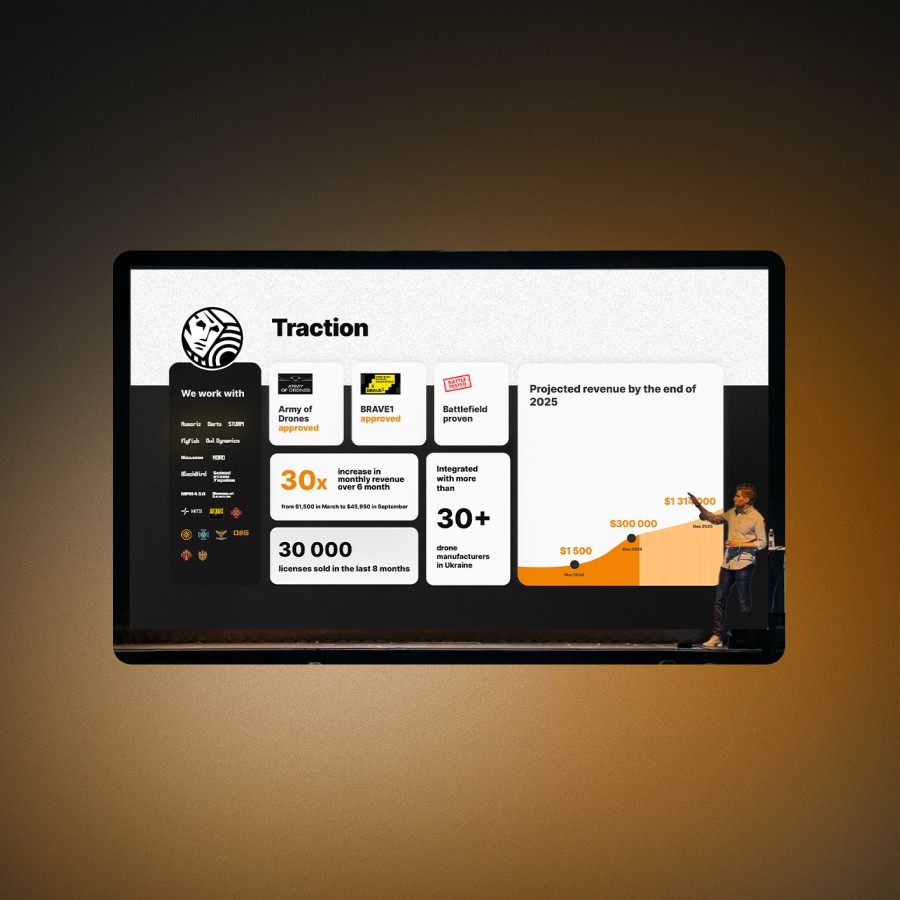 Designed the pitch deck that helped secure $1M in funding for a Ukrainian defense tech startup. Translated complex drone technology into a clear narrative that investors could follow.