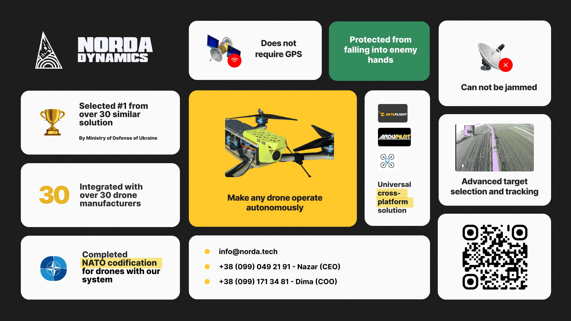 Norda Dynamics develops autonomous software that allows drones to operate without GPS in combat zones. I was brought in to design their primary investor pitch deck.