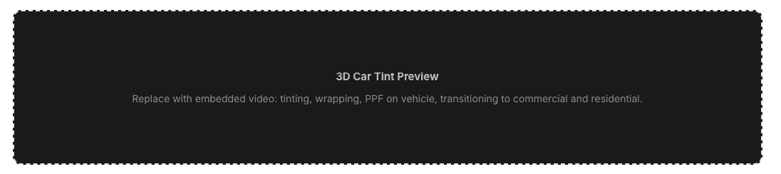 We considered covering the service range with static photos from multiple angles. But the 3D video shows tinting, wrapping, and paint protection applied to the same vehicle, then transitions to commercial and residential tinting, all in about 15 seconds. It communicates the full scope of services faster and more clearly than scrolling through 10 separate images would. I wrote the script, drew the storyboards, and directed a freelance 3D motion designer through production. The final asset was embedded as a lightweight video loop to keep page load fast and SEO-friendly.