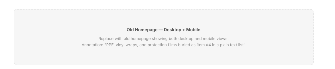 The site's structure followed the business's internal logic: services organized by film brand and product type, with individual pages for every film variant, vehicle category, and application method. That made sense for SEO. Each page targeted a specific long-tail keyword. But for a customer trying to figure out which service they needed, the structure was impossible to navigate.